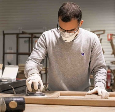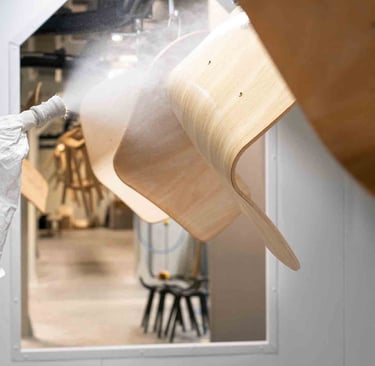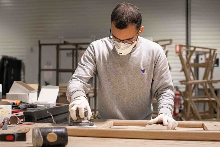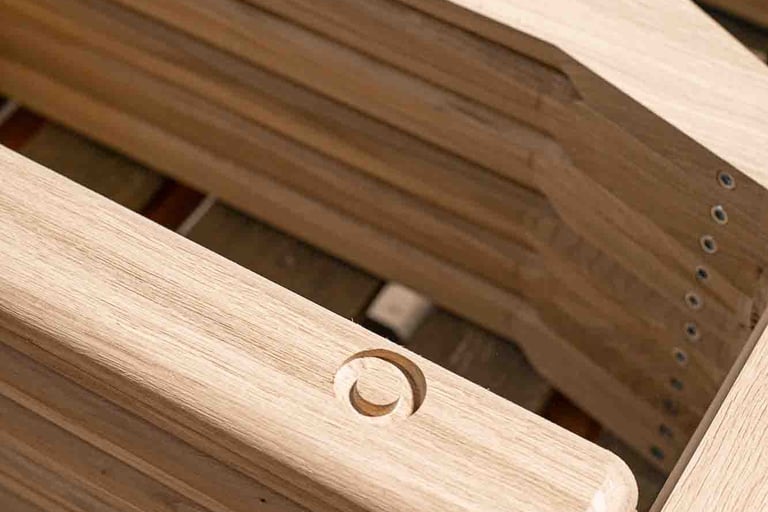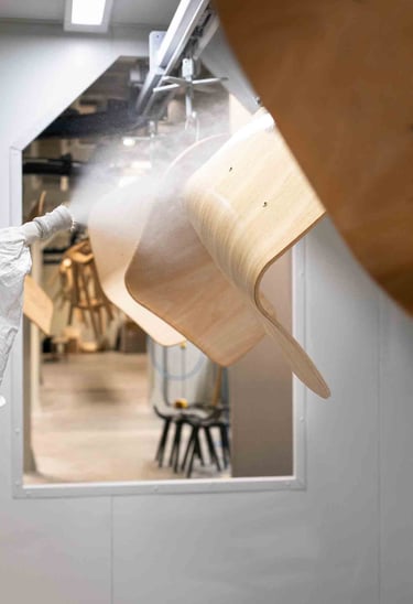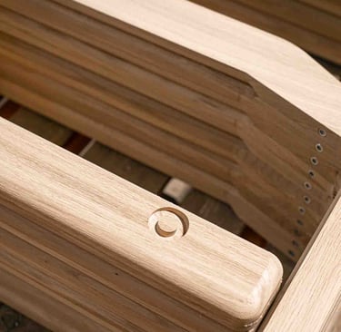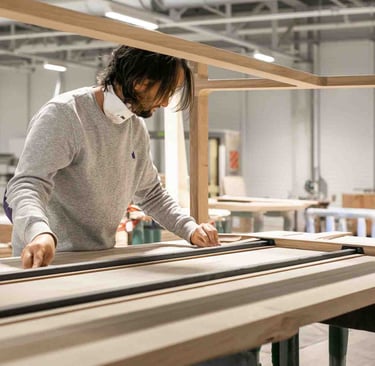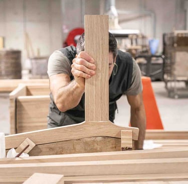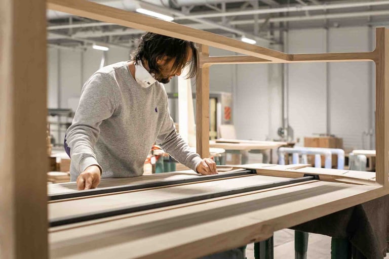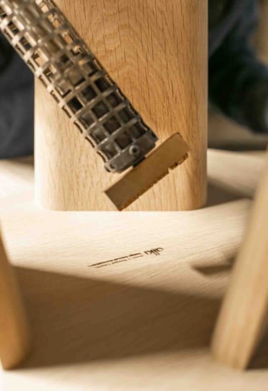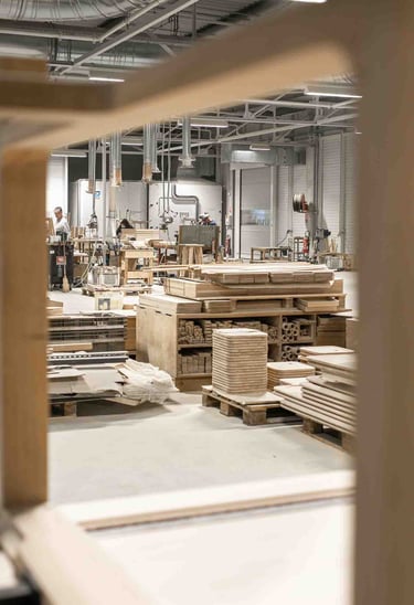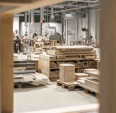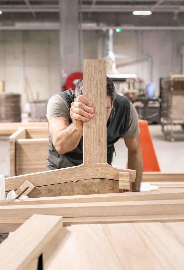 Ici, à Larressore, les yeux sont partout, sur le bâtiment recouvert d'écailles qui reflètent la lumière partout. En entrant dans le magnifique hall, on est attiré par le showroom situé en bas et par la petite boutique d'objets basques. L'espace est incroyable ! Je suis accueillie, avec la même envie et la même gentillesse, par toutes les personnes qui passent par là et m'aident, dans ces 8 000 m², à retrouver le grand sourire de Marine. Les ateliers sont immenses, c'est beau, ça sent le bois. Tout est minutieux, précis et bien rangé. L'ambiance est apaisante, et les artisans, pourtant à la tâche, sont naturellement ouverts à m'expliquer le sens de ce qu'ils font. C'est de l'attachement aux racines basques, et en imaginant un avenir meilleur, qu'Alki est né. Leurs meubles sont comme ça : avec des racines et des ailes.