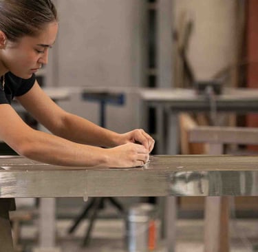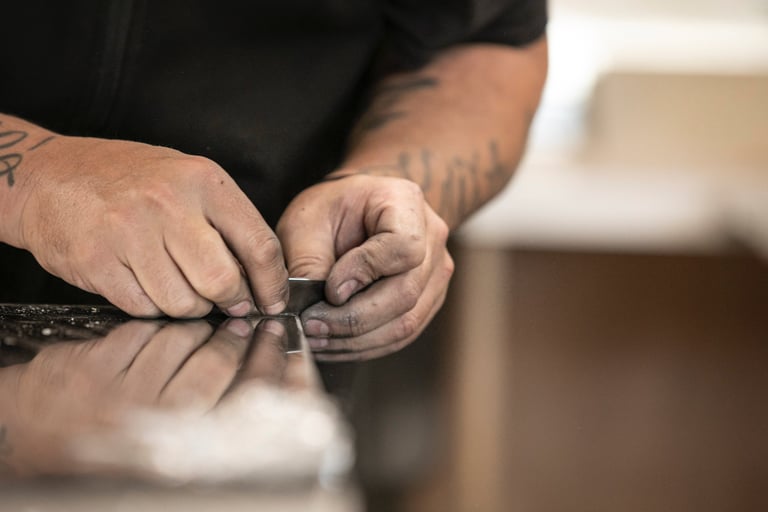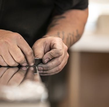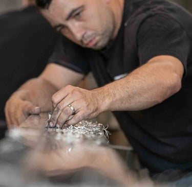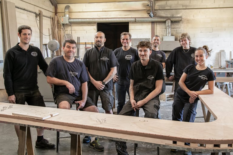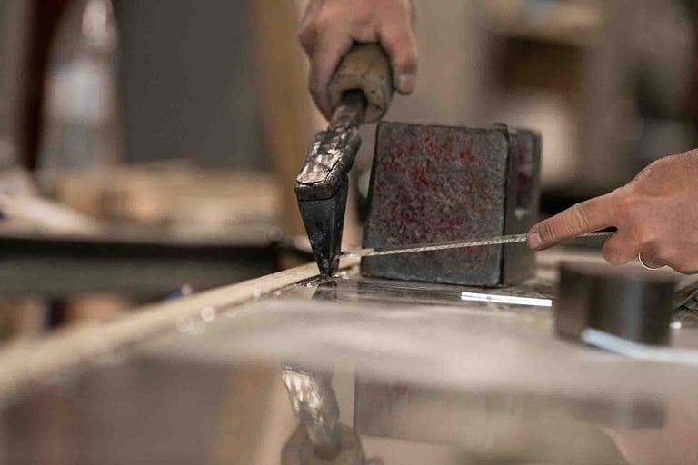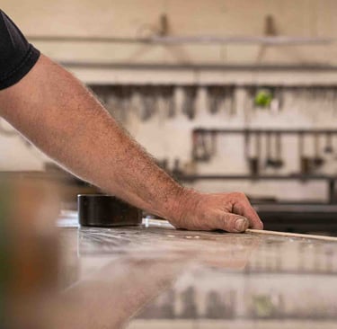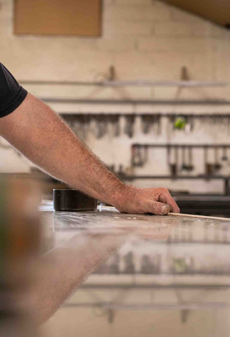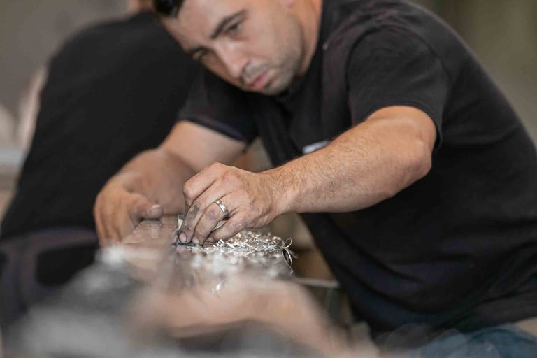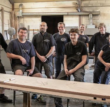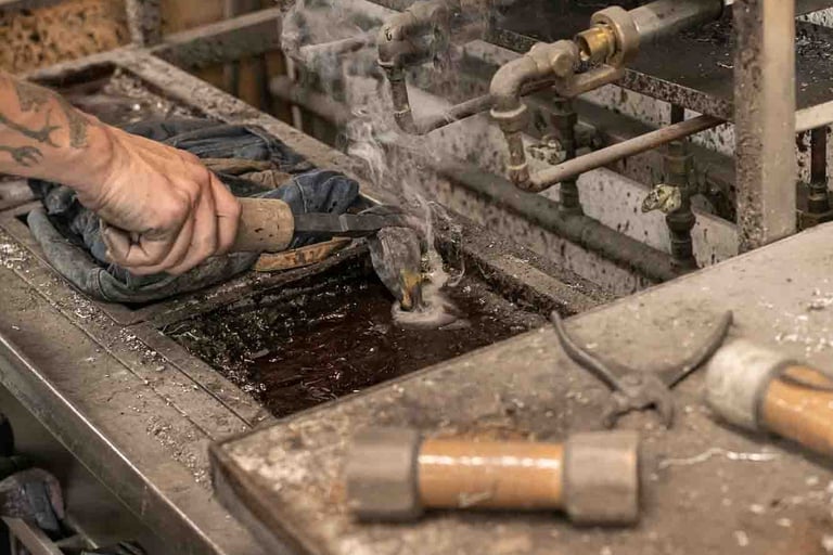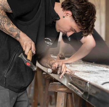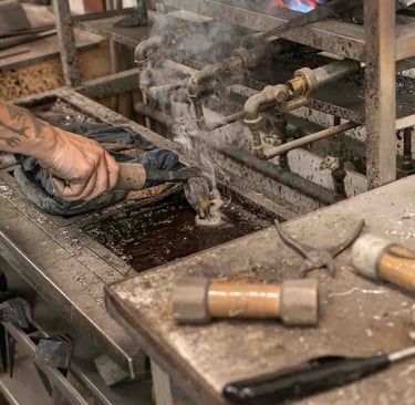 Ici, à Dax, dans un grand atelier ouvert, on est accueilli par Maxime Dethomas comme dans un café : avec un sourire chaleureux et... un café. Ici, on rigole, on écoute des playlists choisies ensemble, on ne ménage pas ses efforts (physiques !) et on fait les choses avec les mains et le cœur. Les ateliers existent depuis 1930. Aujourd'hui, plusieurs générations d'artisans, dont une jeune artisane, travaillent ensemble et forment presque une chorégraphie autour de pièces parfois impressionnantes. C'est un travail d'orfèvre pour que la matière garde sa force et révèle toute sa douceur. Et le geste, précis, doit être un savant mélange entre finesse et fermeté. L'étain est costaud et fragile... un peu comme nous :)